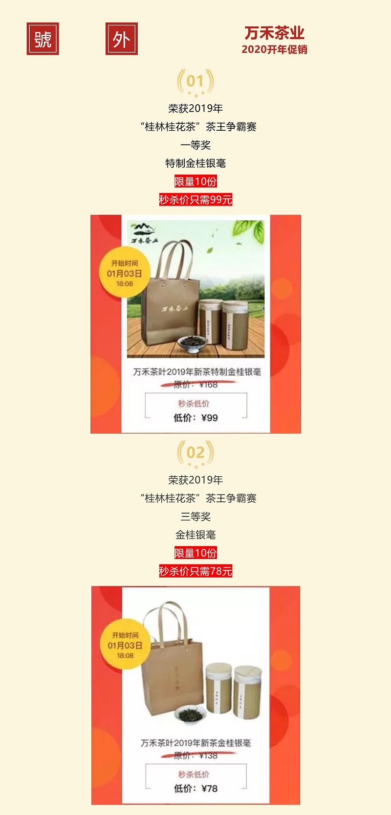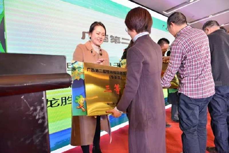 2019年12月5日,在廣西第二屆“桂林桂花茶”發展峰會上,廣西萬禾茶業的“萬禾幽香一號(特制金桂銀毫)”“萬禾幽香二號(金桂銀毫)”兩款桂花茶,榮獲桂林市第二屆“桂林桂花茶”茶王爭霸賽的一等獎和三等獎。