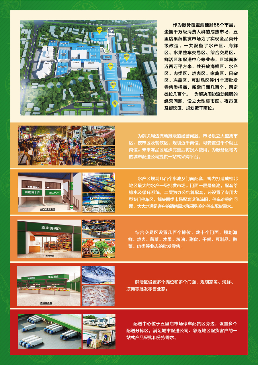 作為服務覆蓋湘桂黔66個市縣,坐擁千萬級消費人群的成熟市場,五里店果蔬批發(fā)市場為了實現全品類升級改造,一共配備了水產區(qū)、海鮮區(qū)、水果整車交易區(qū)、綜合交易區(qū)、鮮活區(qū)和配送中心等業(yè)態(tài),區(qū)域面積近兩萬平方米,共開放海鮮區(qū)、水產區(qū)、肉類區(qū)、燒鹵區(qū)、家禽區(qū)、日雜區(qū)、凍品區(qū)、豆制品區(qū)等11個項批發(fā)零售類招商,新增門面幾百個,固定攤位幾百個。為解決周邊流動攤販的經營問題,設立大型集市區(qū)、夜市區(qū)及餐飲區(qū),規(guī)劃近千商位。