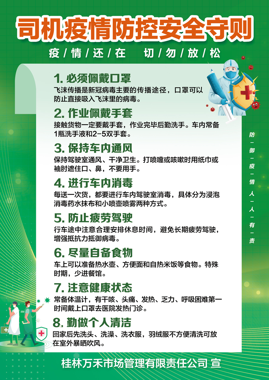 桂林萬(wàn)禾市場(chǎng)管理有限責(zé)任公司對(duì)所有進(jìn)出市場(chǎng)人員嚴(yán)格執(zhí)行測(cè)體溫及掃碼核對(duì)實(shí)名制出入制度、戴口罩、強(qiáng)化場(chǎng)所衛(wèi)生清潔及預(yù)防性消毒等各項(xiàng)疫情防控工作。禁止中高風(fēng)險(xiǎn)地區(qū)人員及車輛進(jìn)入市場(chǎng)。全力保障公司員工、群眾的生命安全和身體健康。