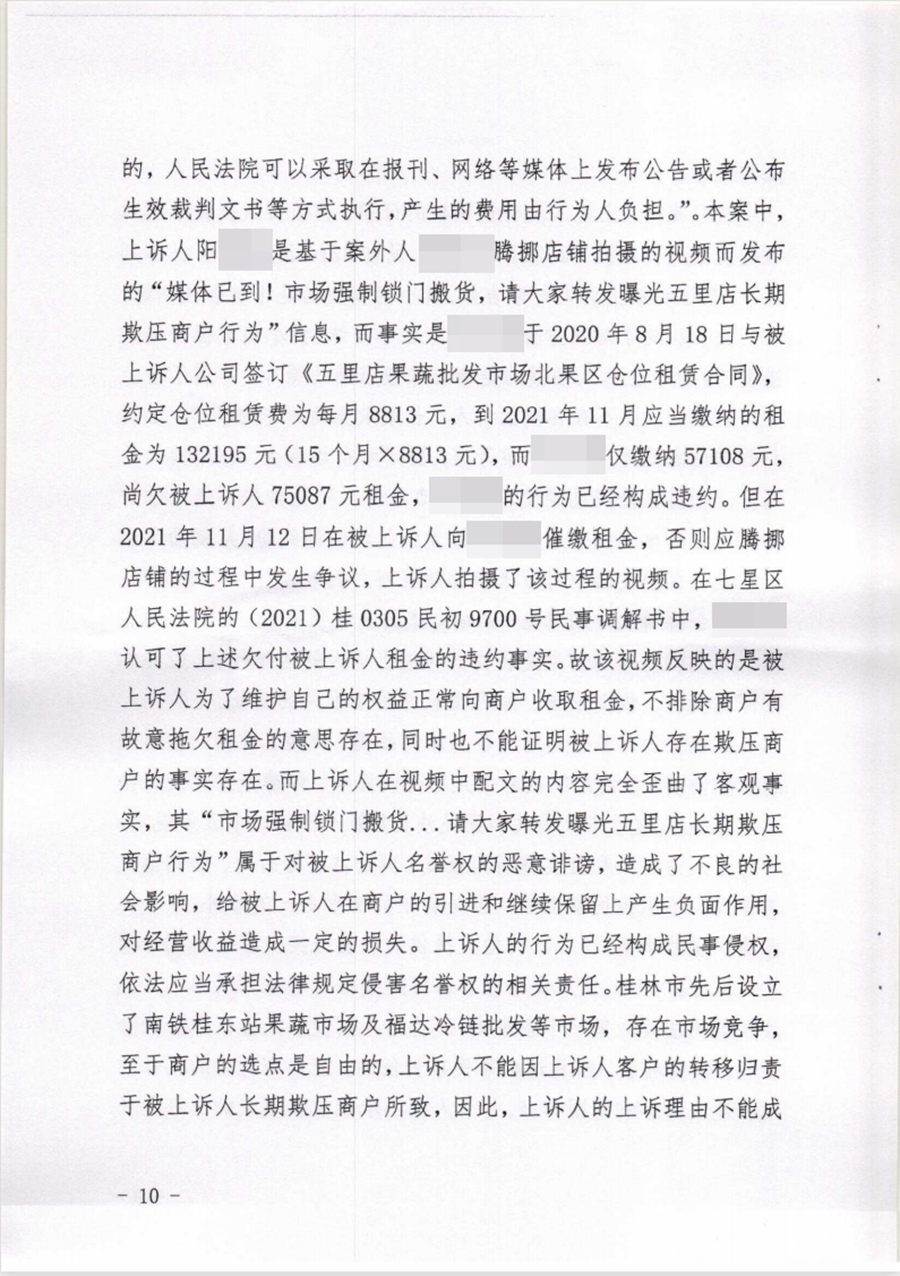 陽某某的母親曾為桂林市五里店果蔬批發市場的商販。2021年11月12日,萬禾市場公司因租賃合同糾紛,對商戶李某某的倉位進行關閉騰退,陽某某在現場對萬禾市場公司保安騰退場景進行錄像,發布在其微信朋友圈,并附文字:“媒體已到!市場強制鎖門搬貨,請大家轉發曝光五里店長期欺壓商戶行為。”陽某某在微信朋友圈發布的涉案視頻及文字“長期欺壓商戶”的侮辱性言辭貶損侵害了萬禾市場公司的名譽權,致萬禾市場公司產生租金等損失,造成不良影響。