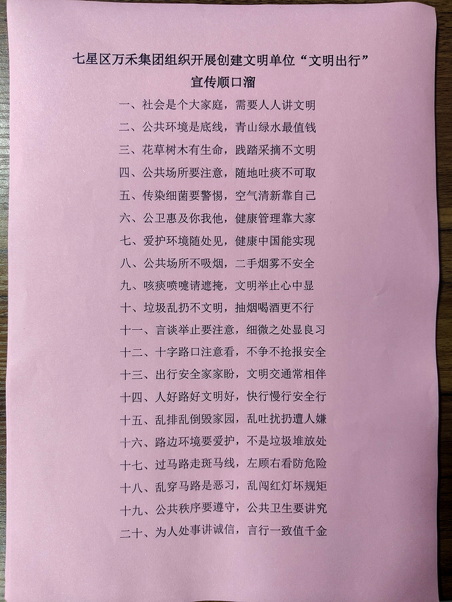 開展此次活動,共計發放“文明出行”順口溜宣傳單80余份,切實提高了廣大市民對環境衛生的愛護意識,號召大家文明出行從我做起,從身邊的小事做起,鼓勵大家做文明出行的傳播者,為鞏固提升全國文明城市成果貢獻自己的一份力量。
