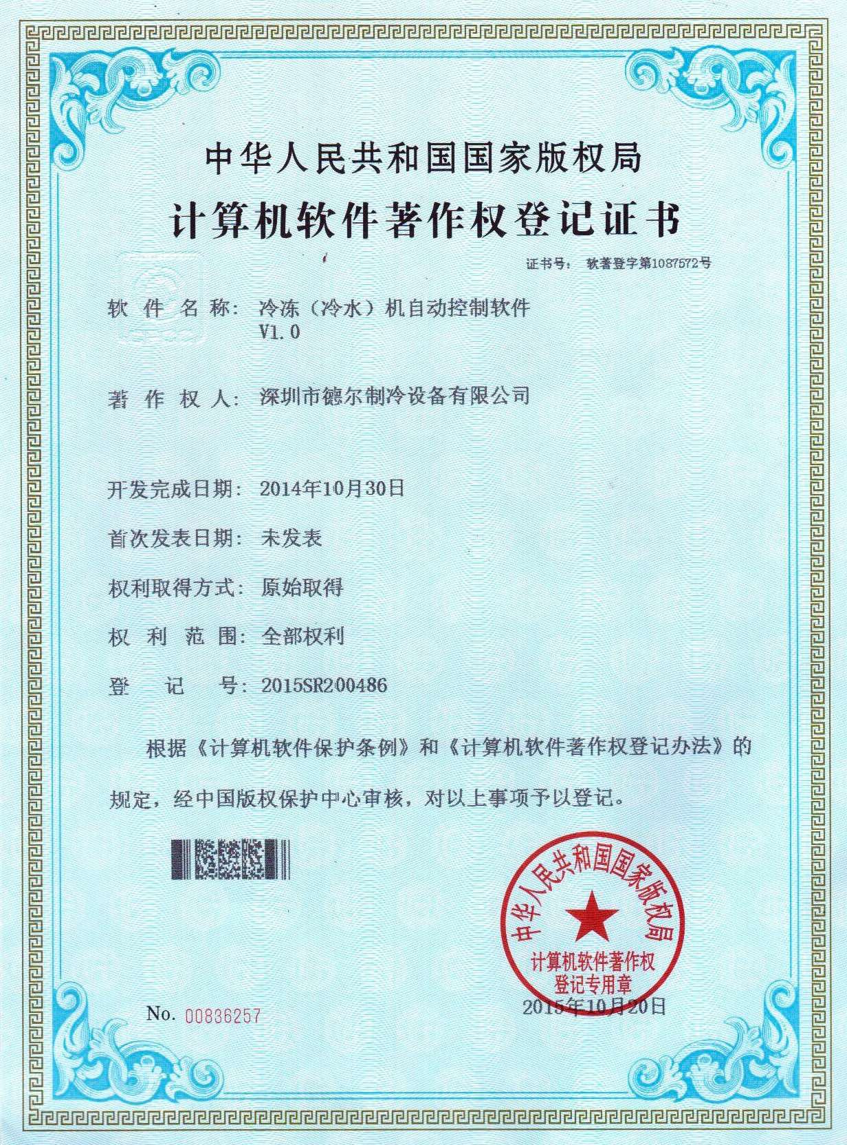 冷凍機(jī)組自控系統(tǒng) 軟件著作權(quán)證書
