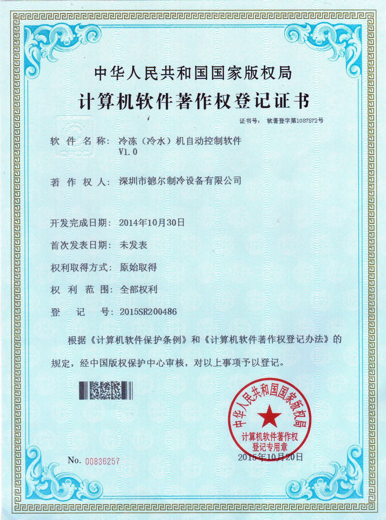 低溫復(fù)疊設(shè)備智能控制系統(tǒng) 軟件著作權(quán)登記證書