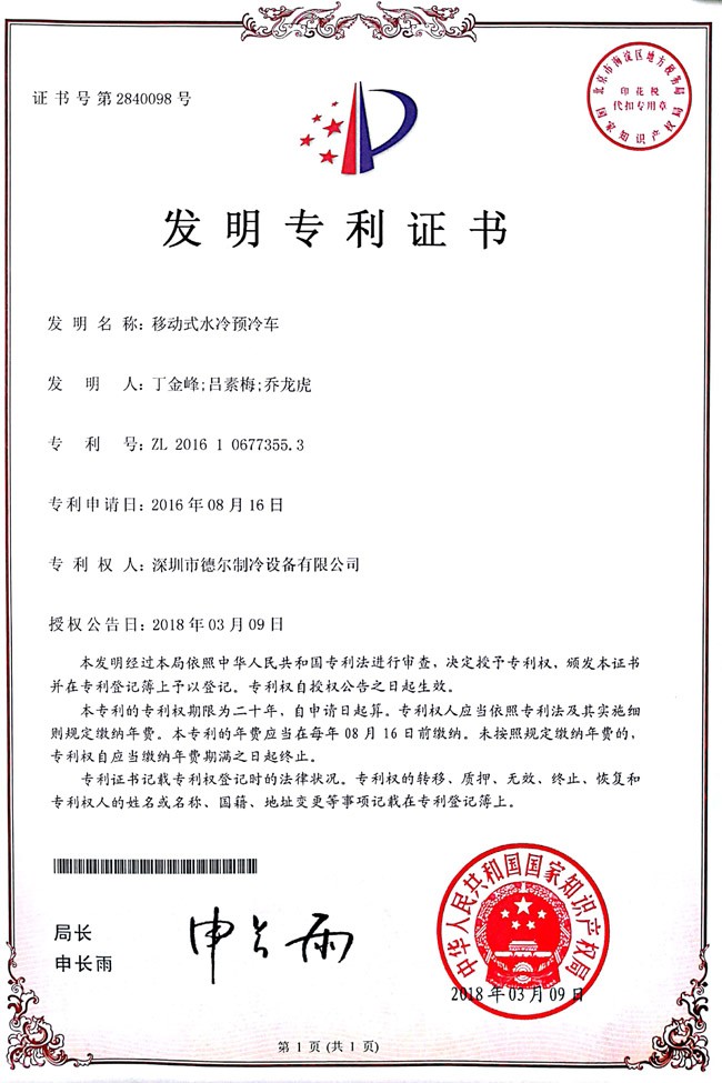 移動式水冷預(yù)冷冷車 發(fā)明證書
