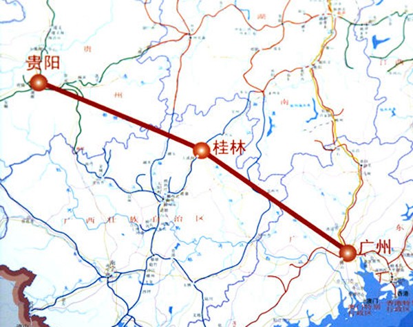 貴廣高速鐵路又稱貴廣客運專線,線路自貴陽北站起,經(jīng)黔南州、黔東南州、廣西桂林、賀州、廣東云浮、肇慶、佛山終至廣州南站。
